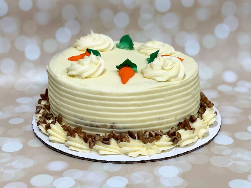 8″ round carrot cake with cream cheese icing and buttercream carrots. Notice: This item has nuts.